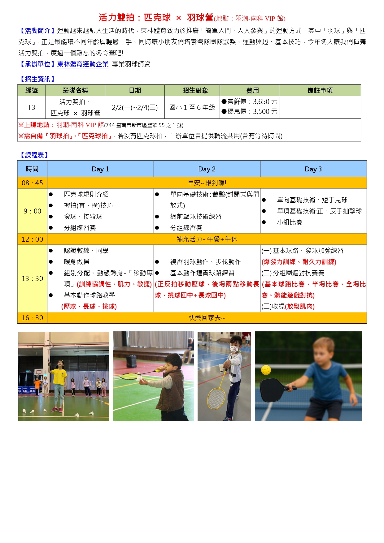 T3-活力雙拍:匹克球 × 羽球營(地點:羽潮-南科VIP館)